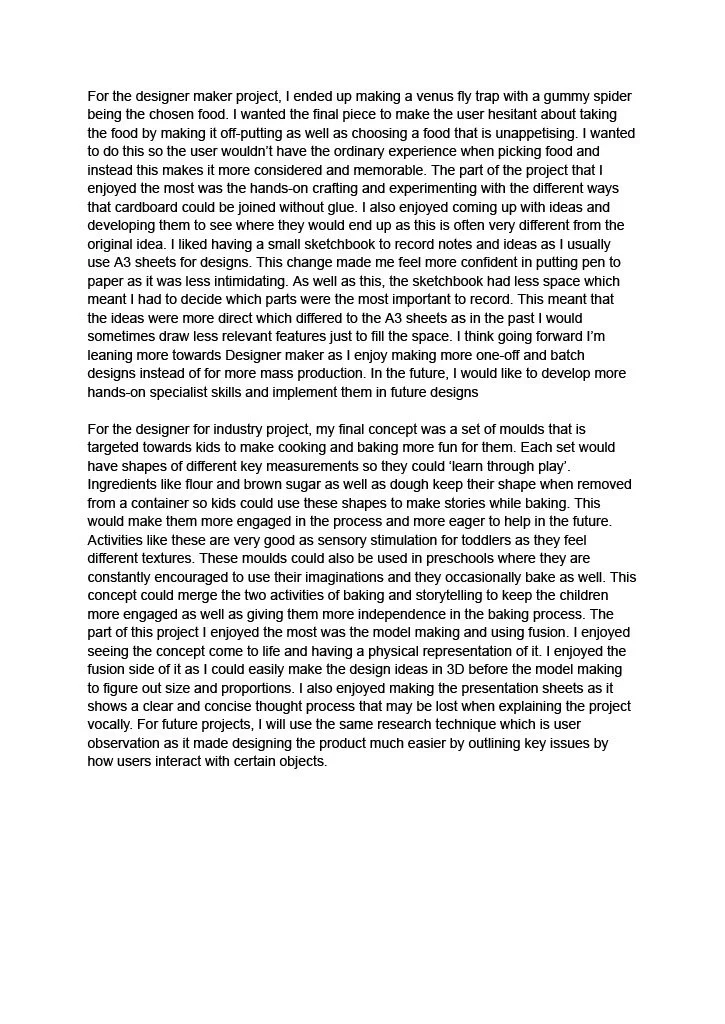 5. A personal statement (1 x A4 side max) outlining a short response to short response to each of the three design briefs with an explanation on how the projects have developed their specialism interest. eg. Design for Industry/ Designer Maker or Interior Design.