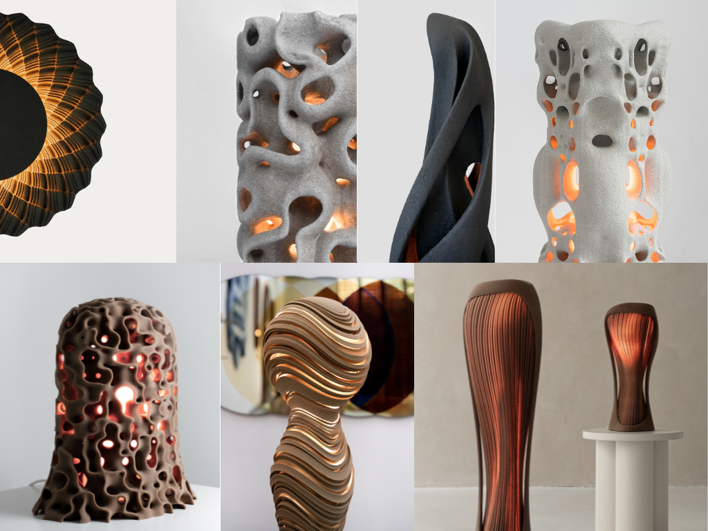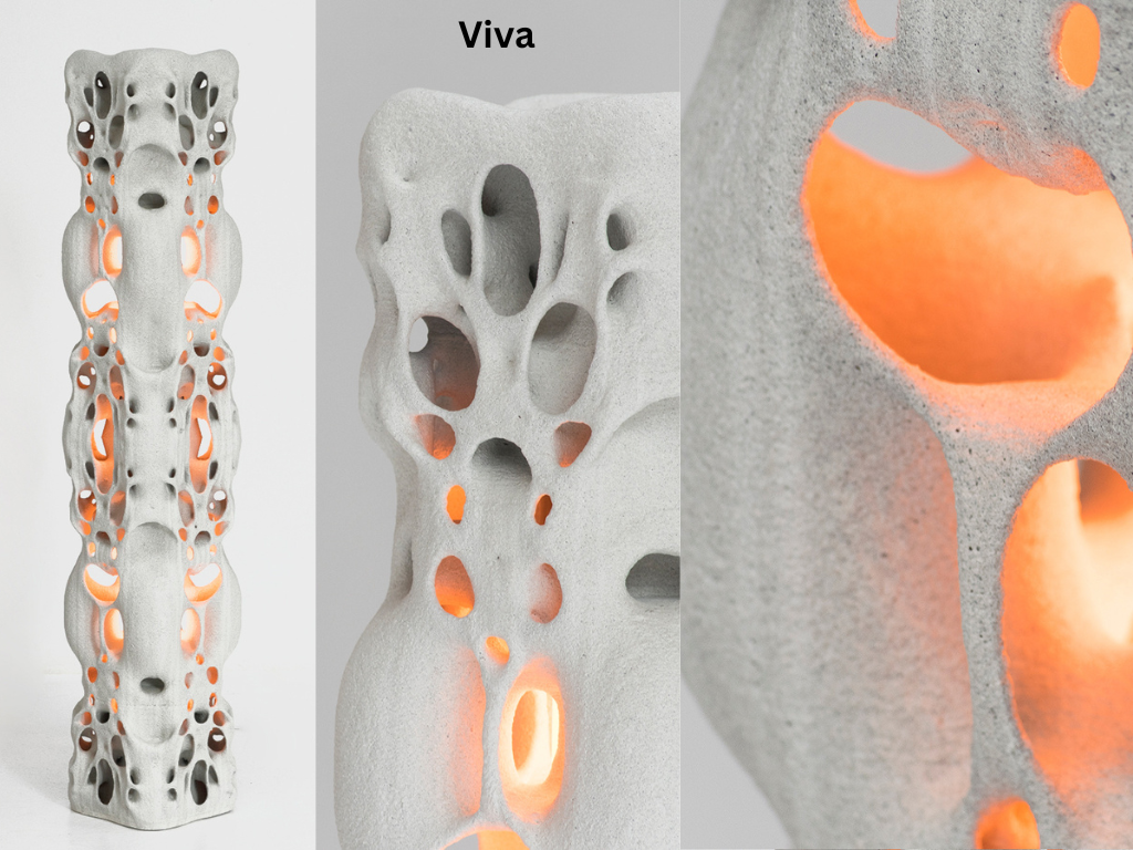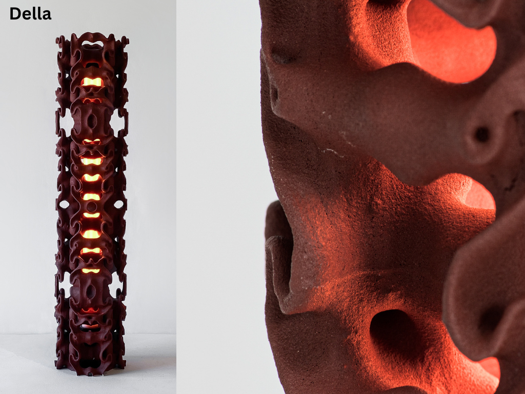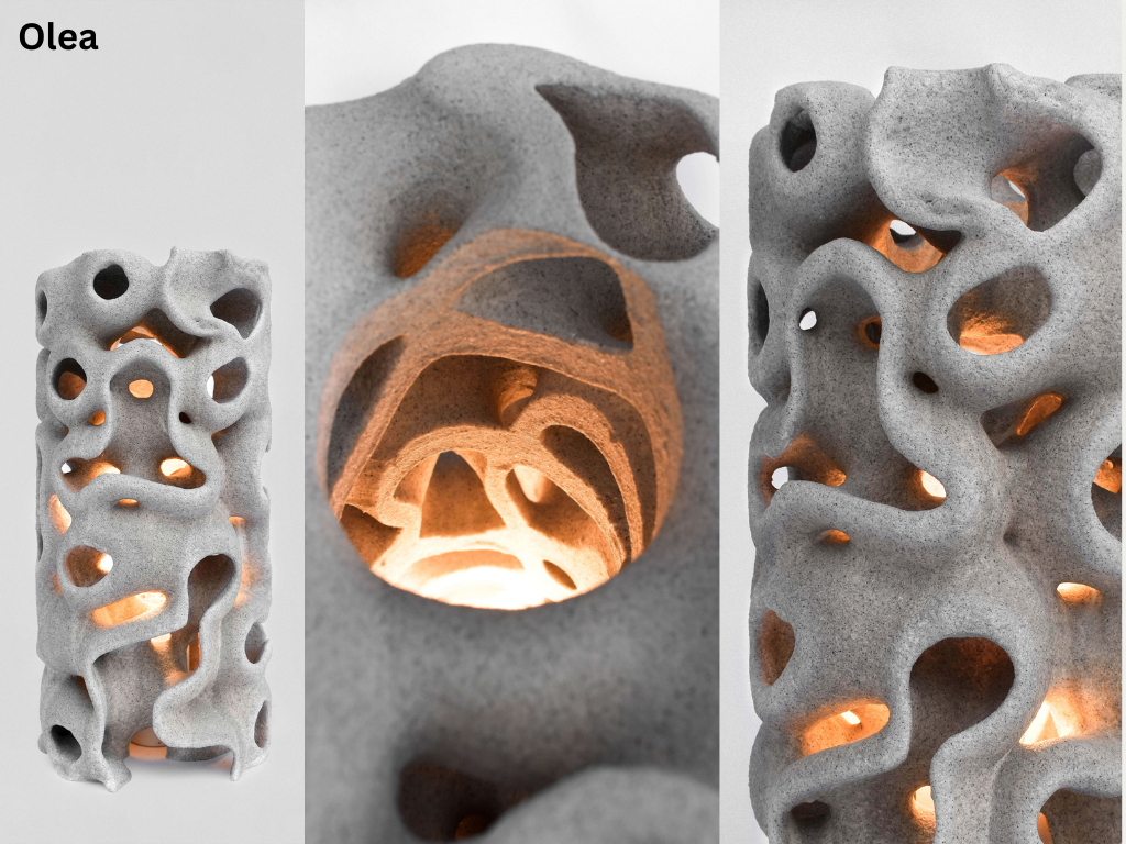 The process used to manufacture these lights is binder jet printing which is an additive process where an industrial printhead deposits a liquid binding agent onto a thin layer of powder particles, in this case sand. This process can create intricate geometries which makes it suitable for these products. As the sand provides support when printing, added supports aren't required which reduces waste and print time