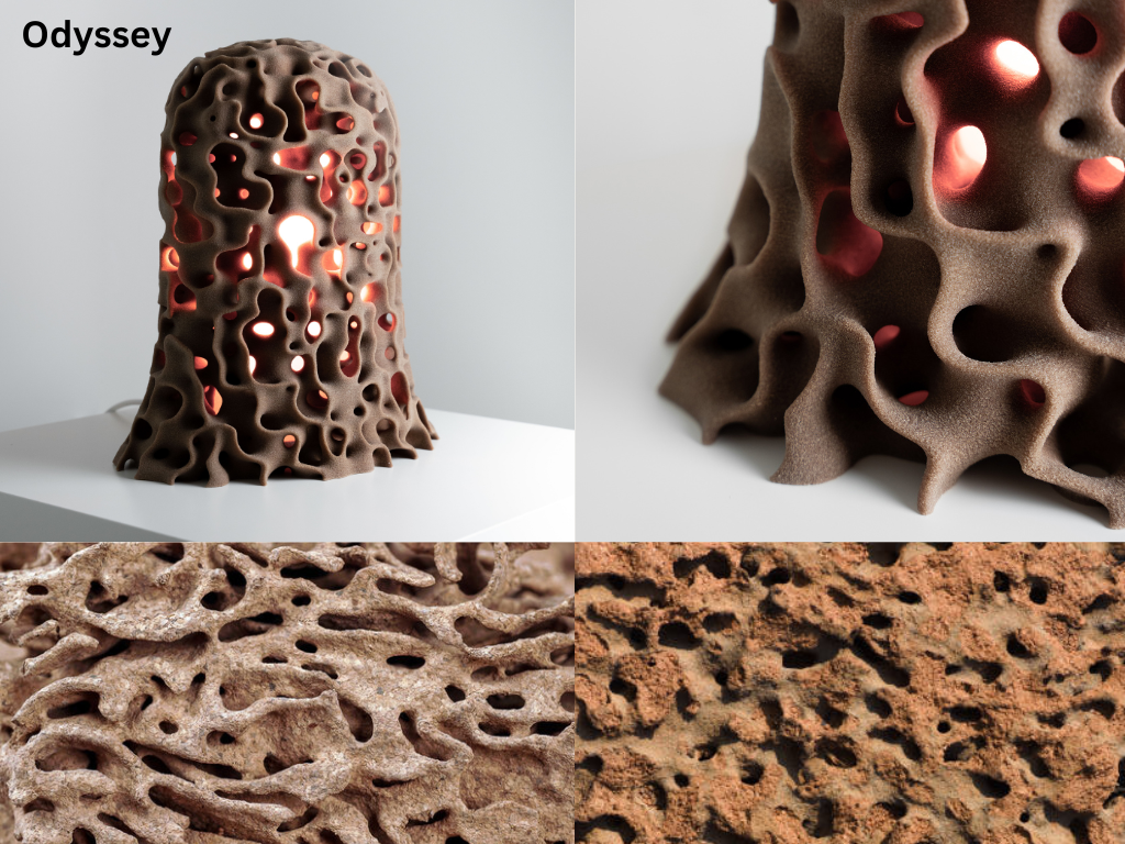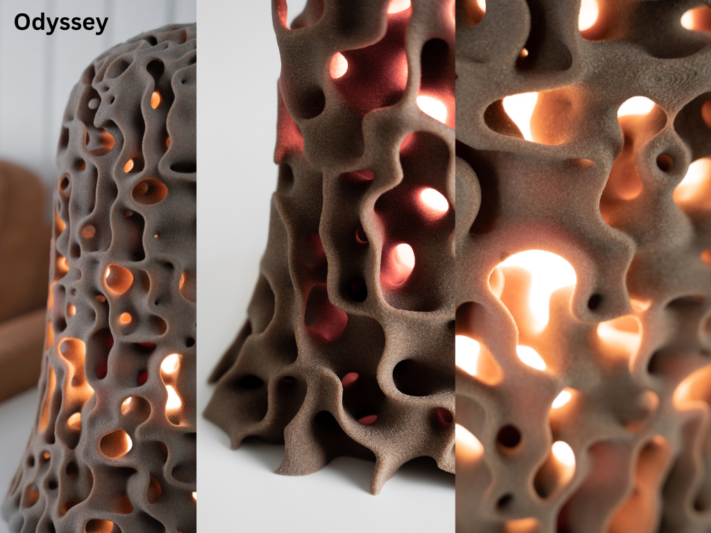 this is the Odyssey light sculpture which is inspired by cosmic forces that shape the natural world. Its form mixes the natural and synthetic which results in a functional lamp that is also a piece of art. The odyssey is also part of a new ongoing project called liquid roots which aims to address the depletion of biodiversity in urban environments.