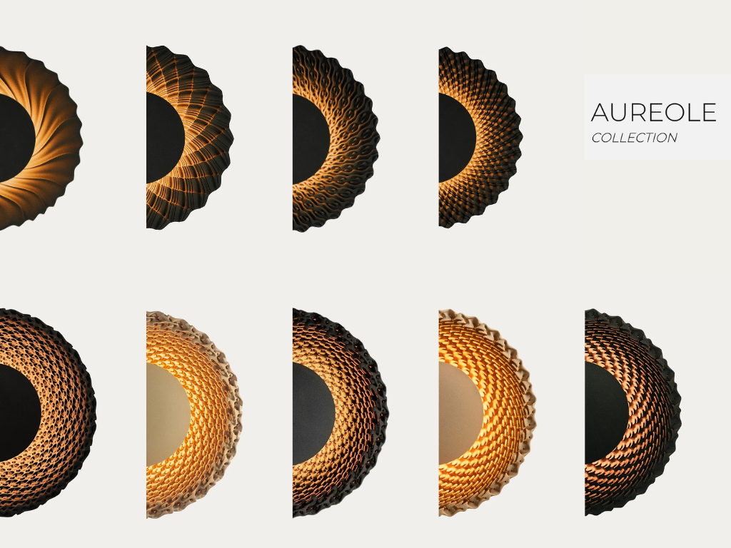 The Areole collection is a range of wall mounted lighting pieces called 'suns' that are inspired by sunflowers and their intricate inner disks. Each light fixture has a unique surface which creates different patterns of contrasting light and shadows. These functional art pieces come in 2 colour options of black and beige making them suitable for any space.