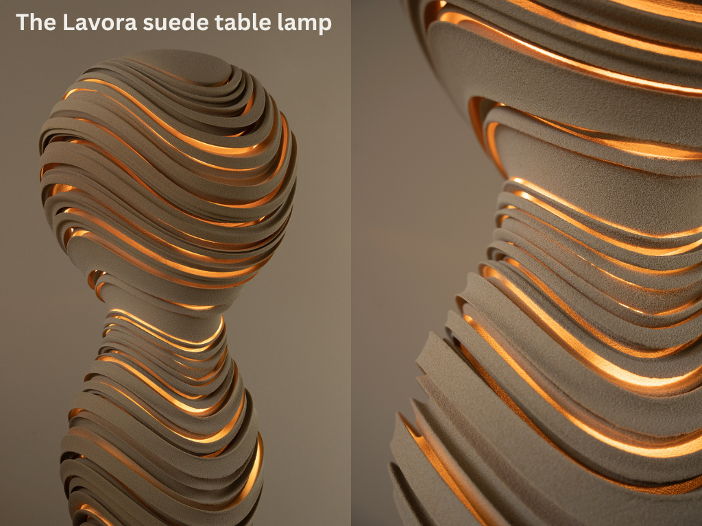 The Lavora suede table lamp is part of the ongoing lavora collection. It takes inspiration from the intricate formation of desert sand dunes as they morph and shift in the breeze. The beige colouring reflects that of the dunes and adds to the aesthetic. The form is made of rolling curves and uses shadows to define depth.