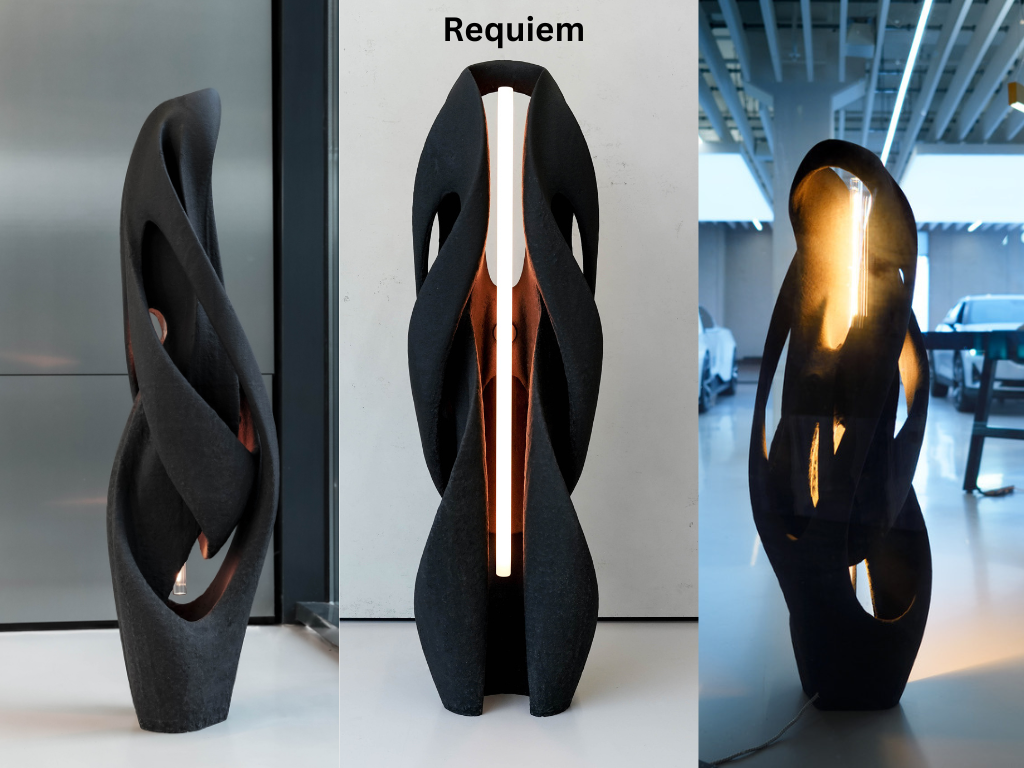 This piece is called Requiem and its a light sculpture with intertwining curves that have different forms and personalities from each side. This encourages the viewers to come up with their own impressions and interpretations of the pieces. It was inspired by those who thrive in hostile environments where resources are minimal and also explores the idea of codependency between organisms