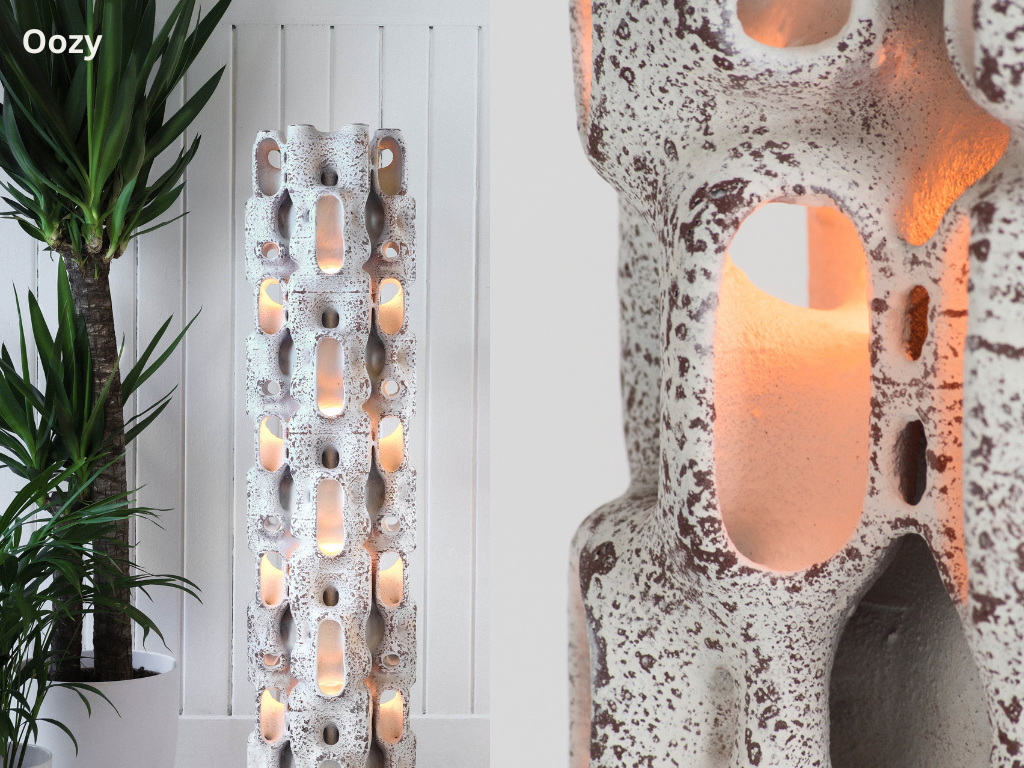 This piece is called the Oozy and its part of the Urban stem collection. This product was intended as an interior light sculpture and it visually reacts and changes in accordance to its environment. The light that emerging from the core softly lights up the centre which is revealed through crevices and cavities creating a soft glow. It is made of PLA, PVA, and sand