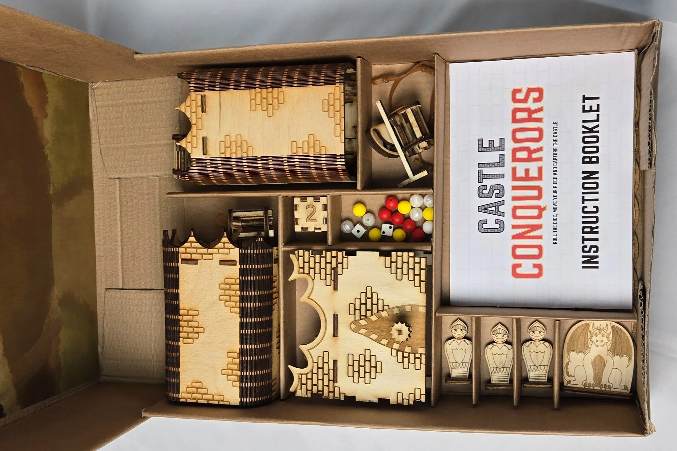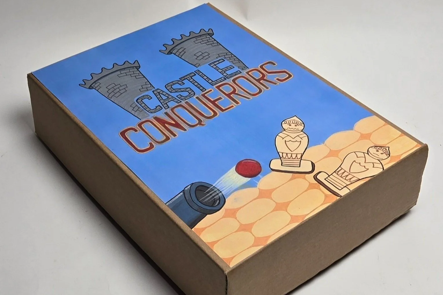 A board game called Castle Conquerors where players battle to control the castle. Made for ages 8+, the game includes shooting cannonballs to protect the castle from the invading knights. Fast gameplay makes the game engaging for younger players and the packaging transforms into a surrounding wall and backdrop to ensure the cannonballs are kept safe and aren't getting lost to keep the gameplay going.