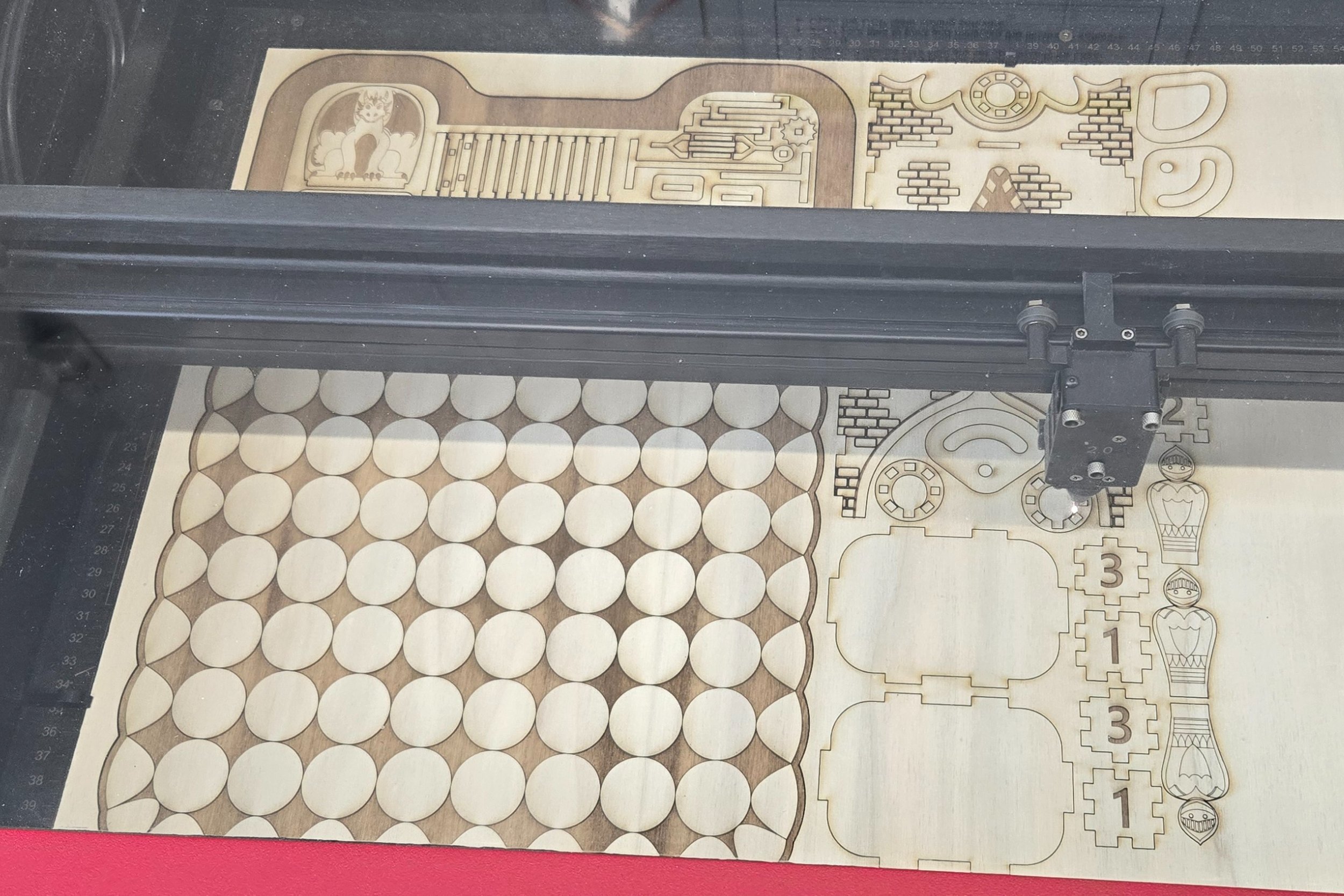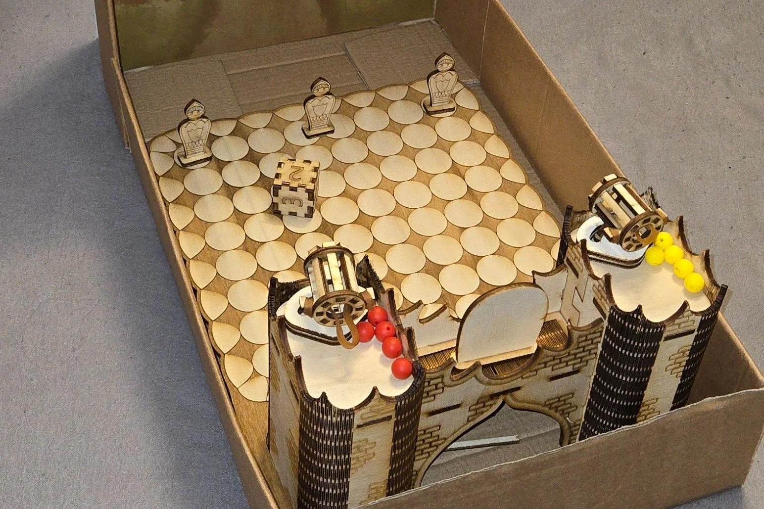 Castle conquerors is made from 4mm laser ply and poplar ply. All pieces can be cut from a single sheet of size 760×440mm. 2 rubber bands are used to make the canons functional as well as each player having 5 soft rubber balls to launch. A spring is also used for the button