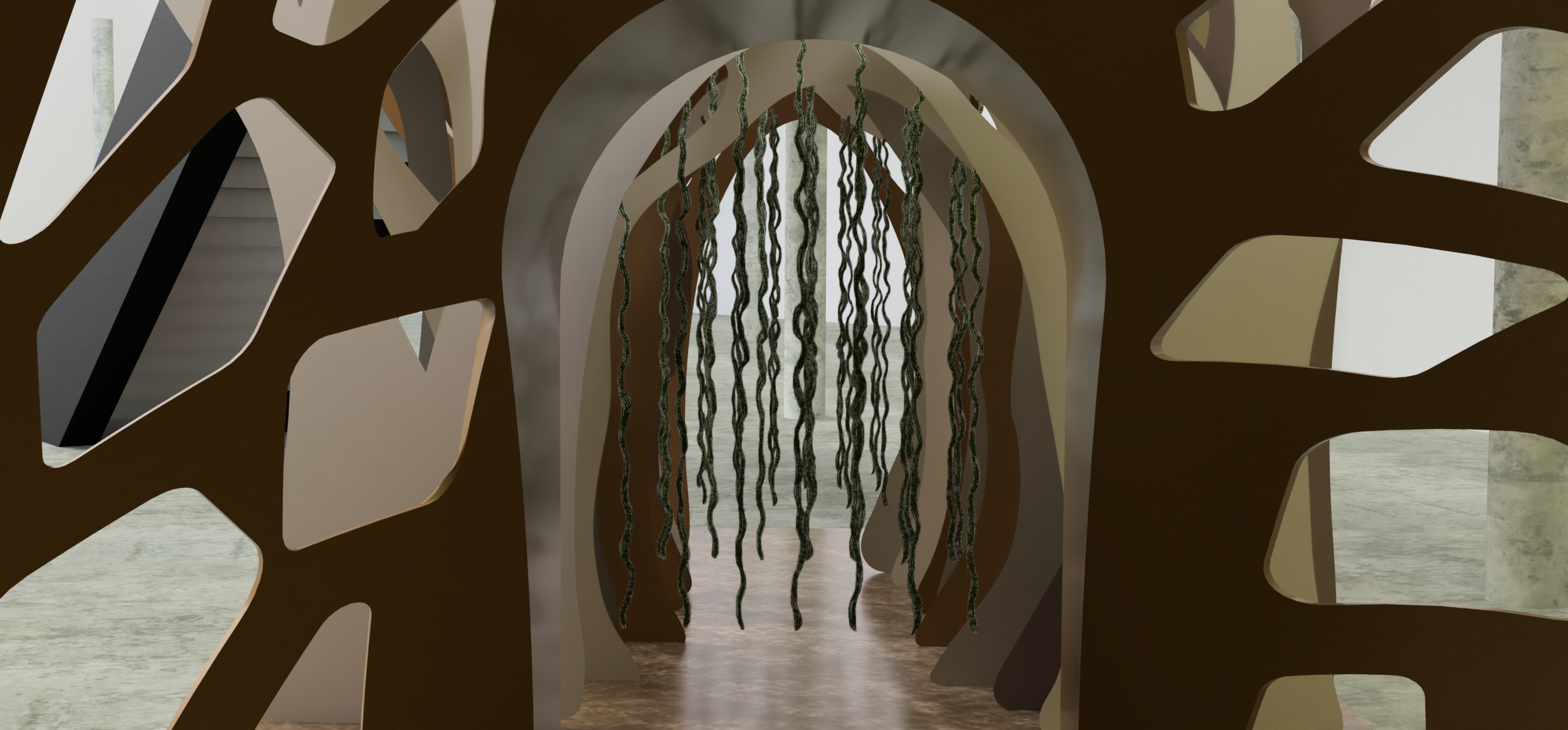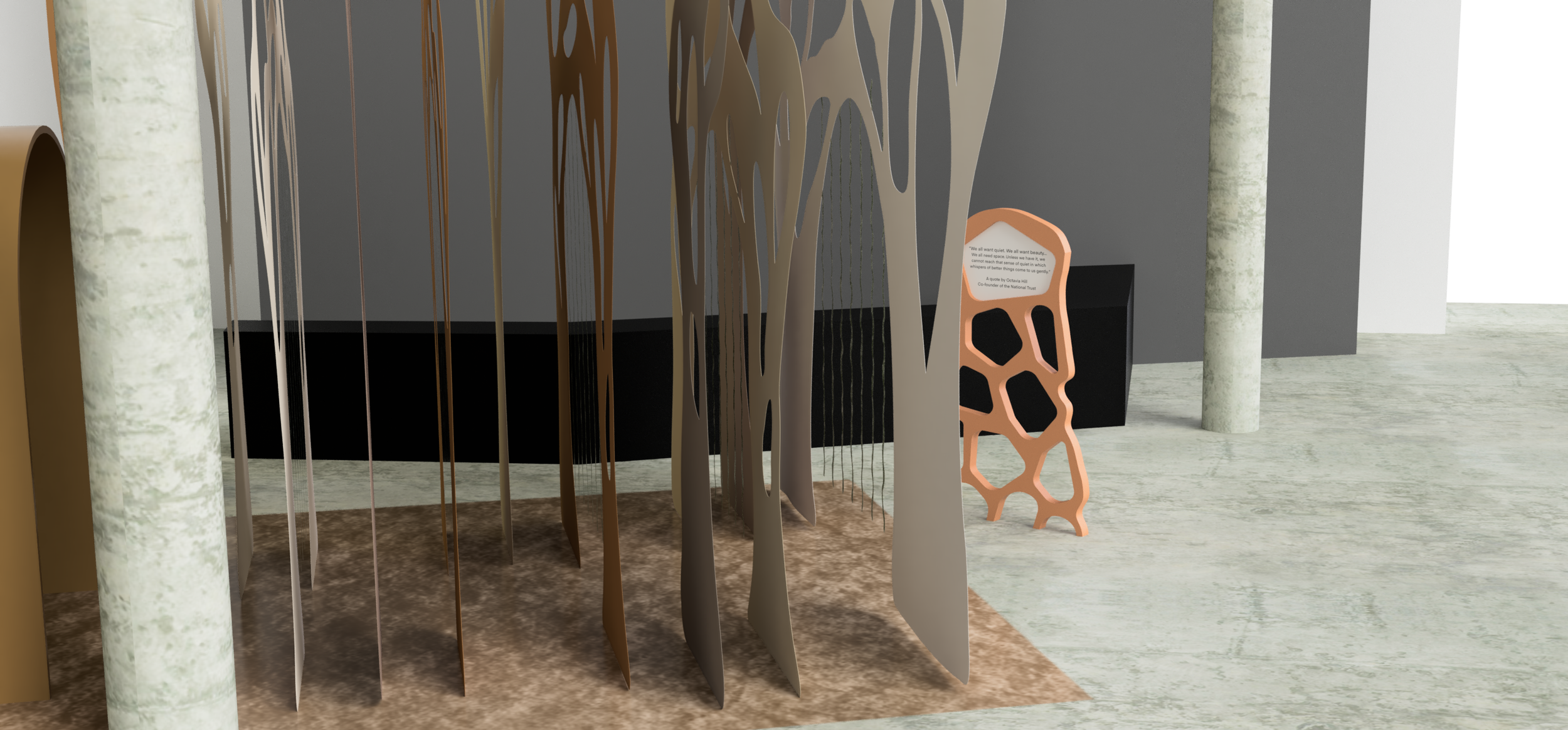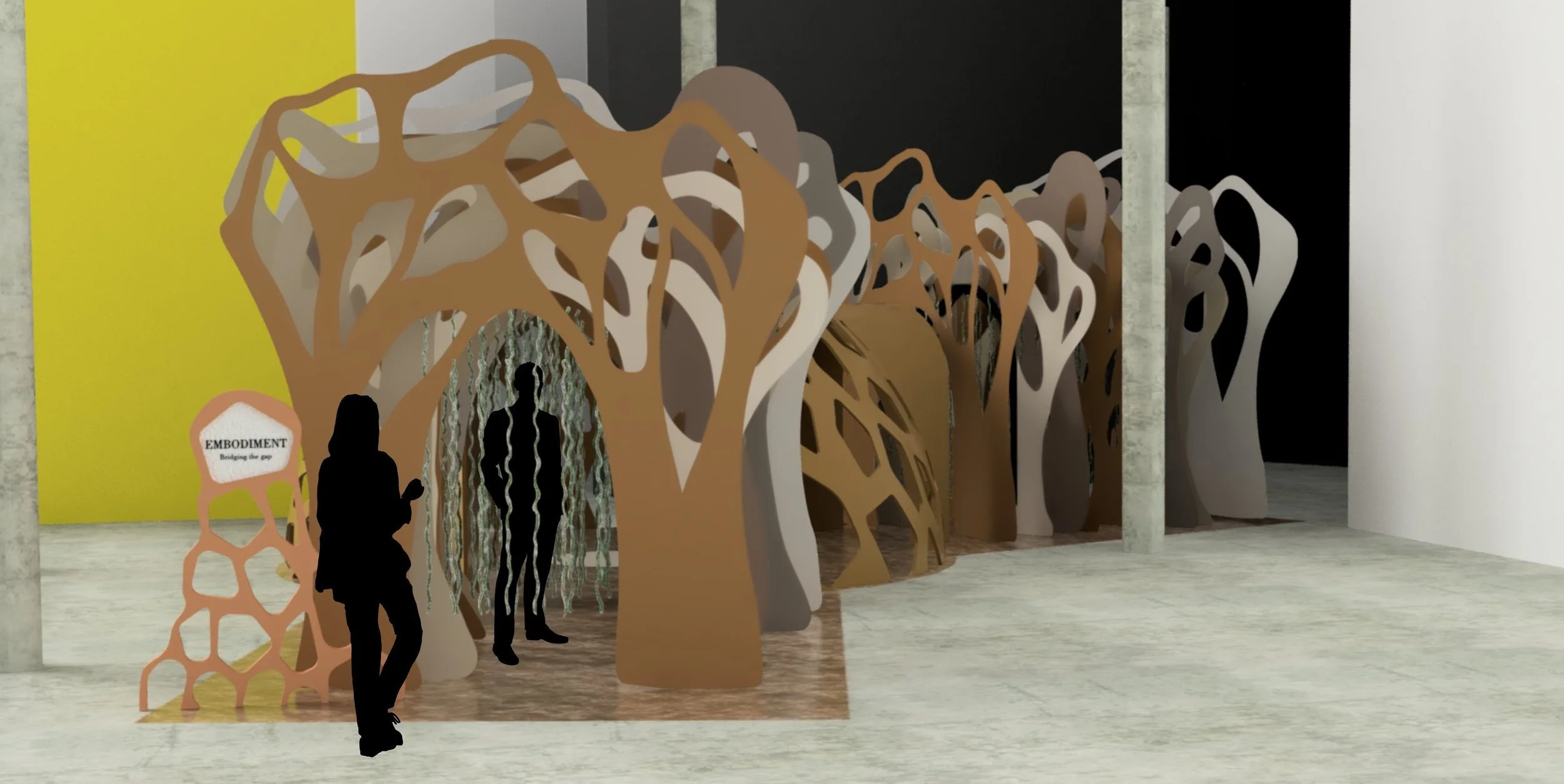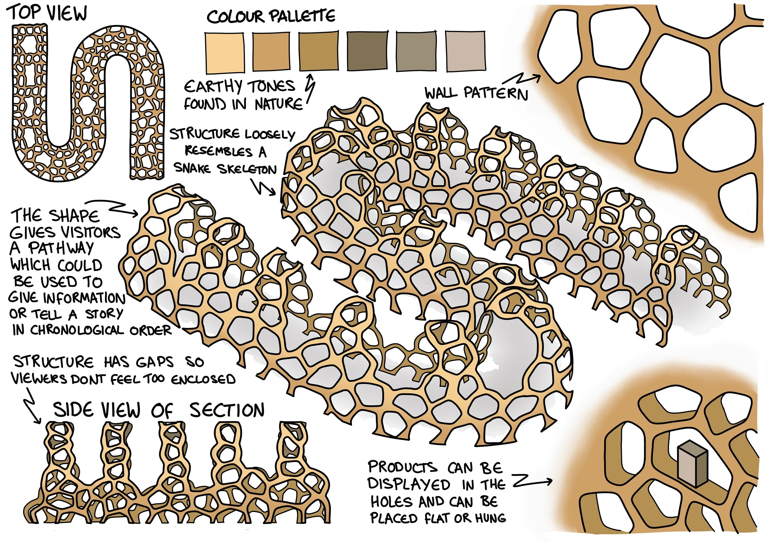 The proposed design would be 3D printed using local soil. The ground would also be made of soil as this would make the experience more immersive. The entrance and exit arches would be made from cardboard which was chosen as it can be readily recycled and is more sustainable than using other materials such as acrylic