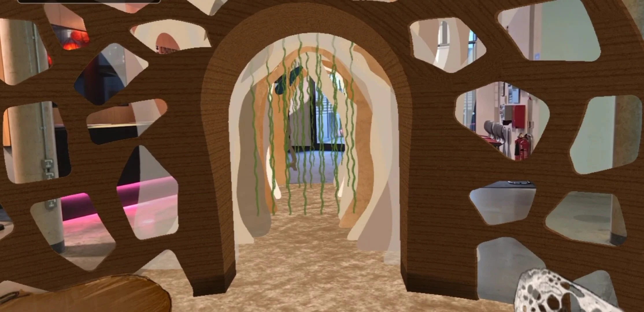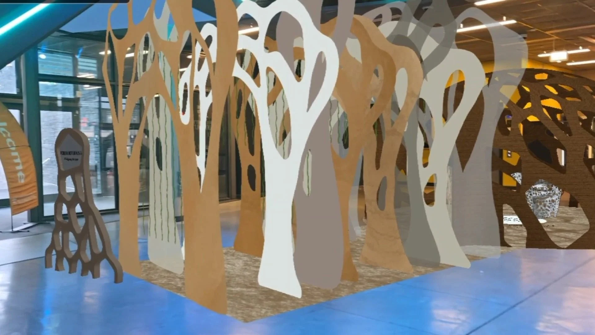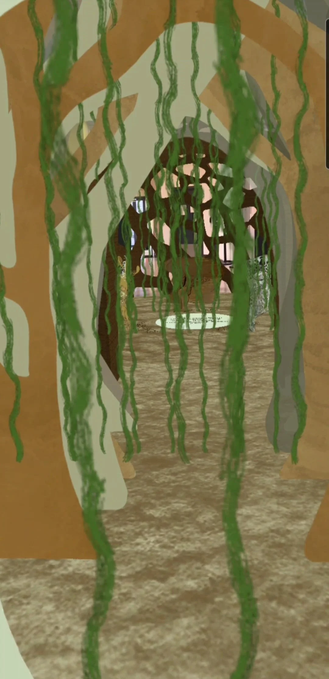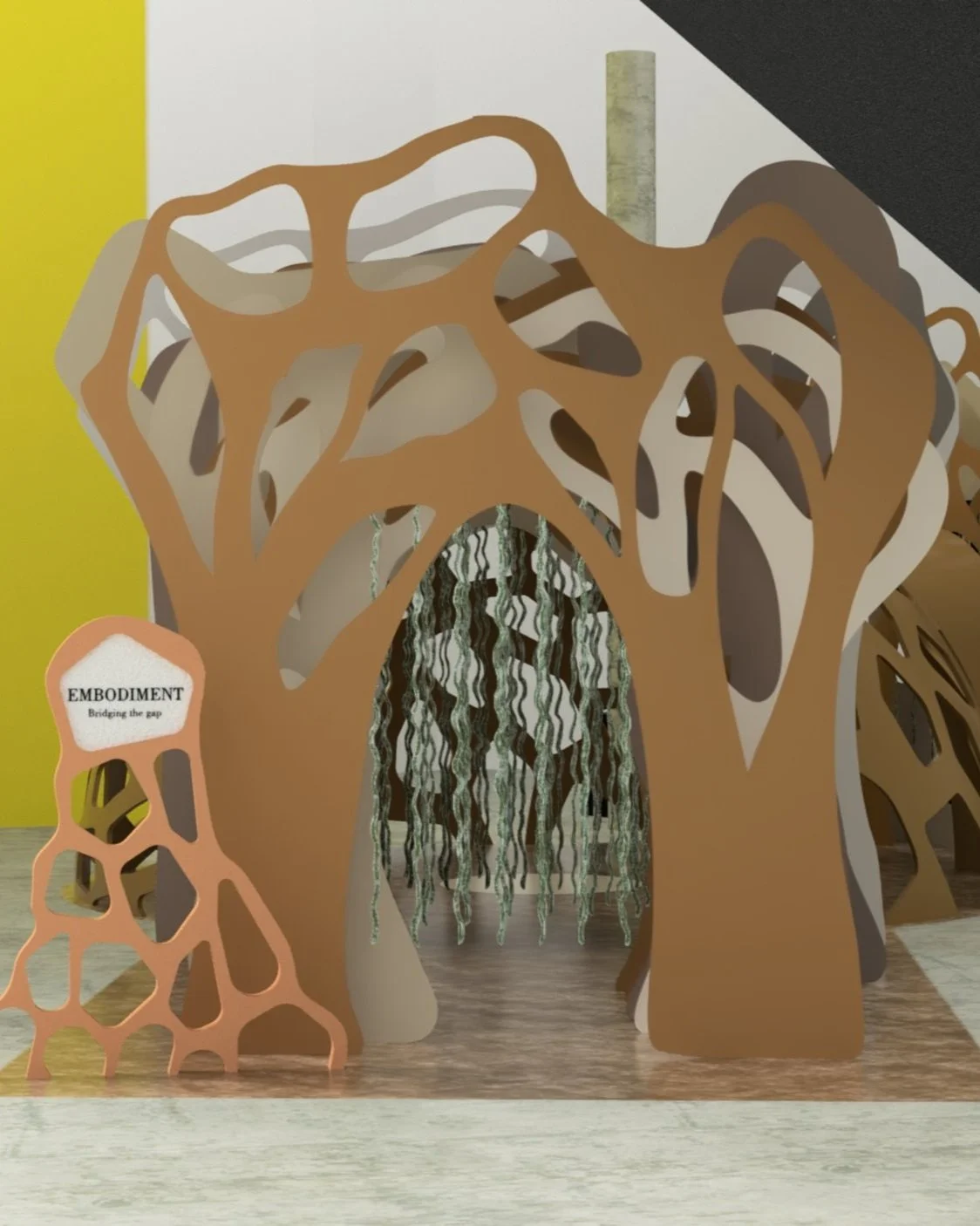 The proposed design would be 3D printed using local soil. The ground would also be made of soil as this would make the experience more immersive. The entrance and exit arches would be made from cardboard which was chosen as it can be readily recycled and is more sustainable than using other materials such as acrylic
