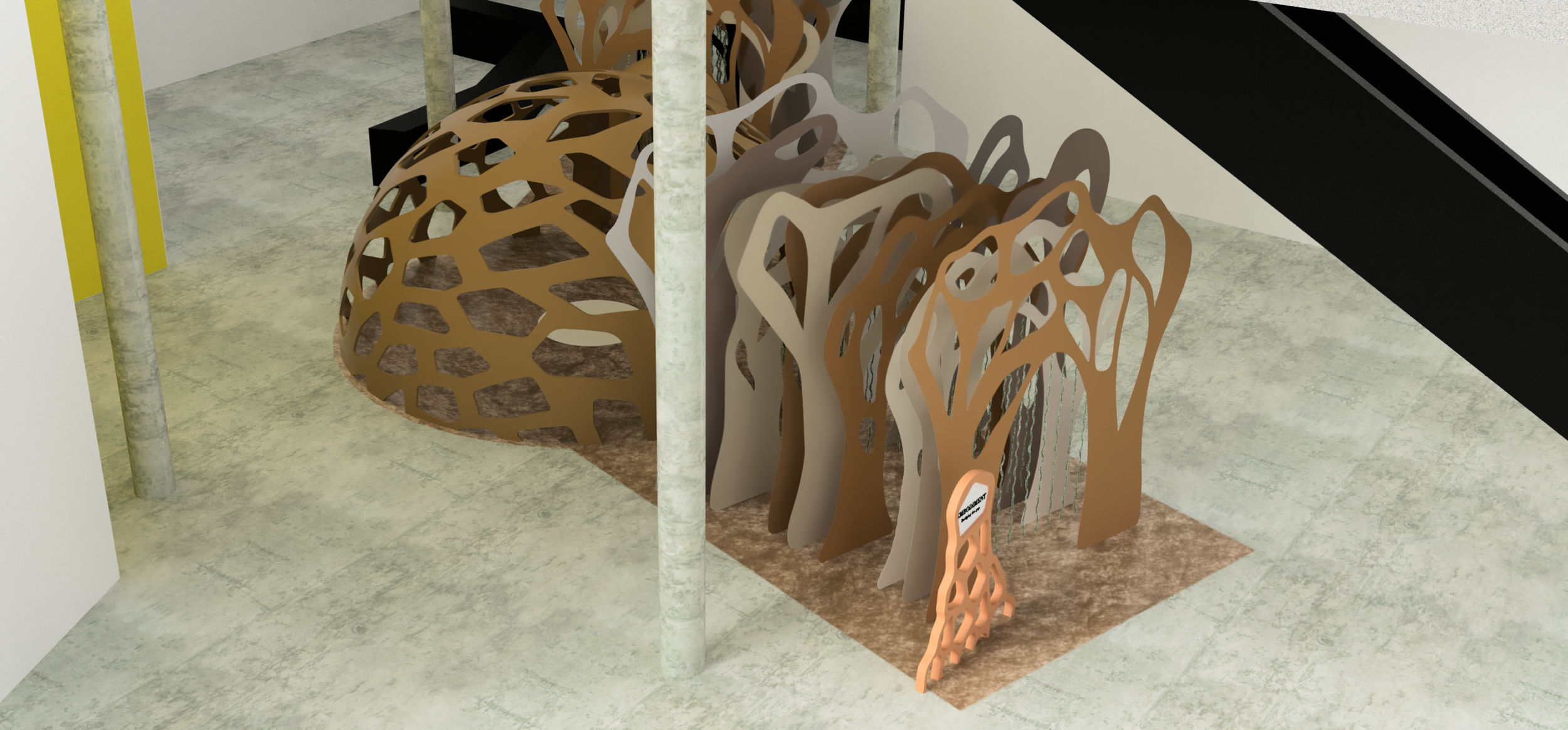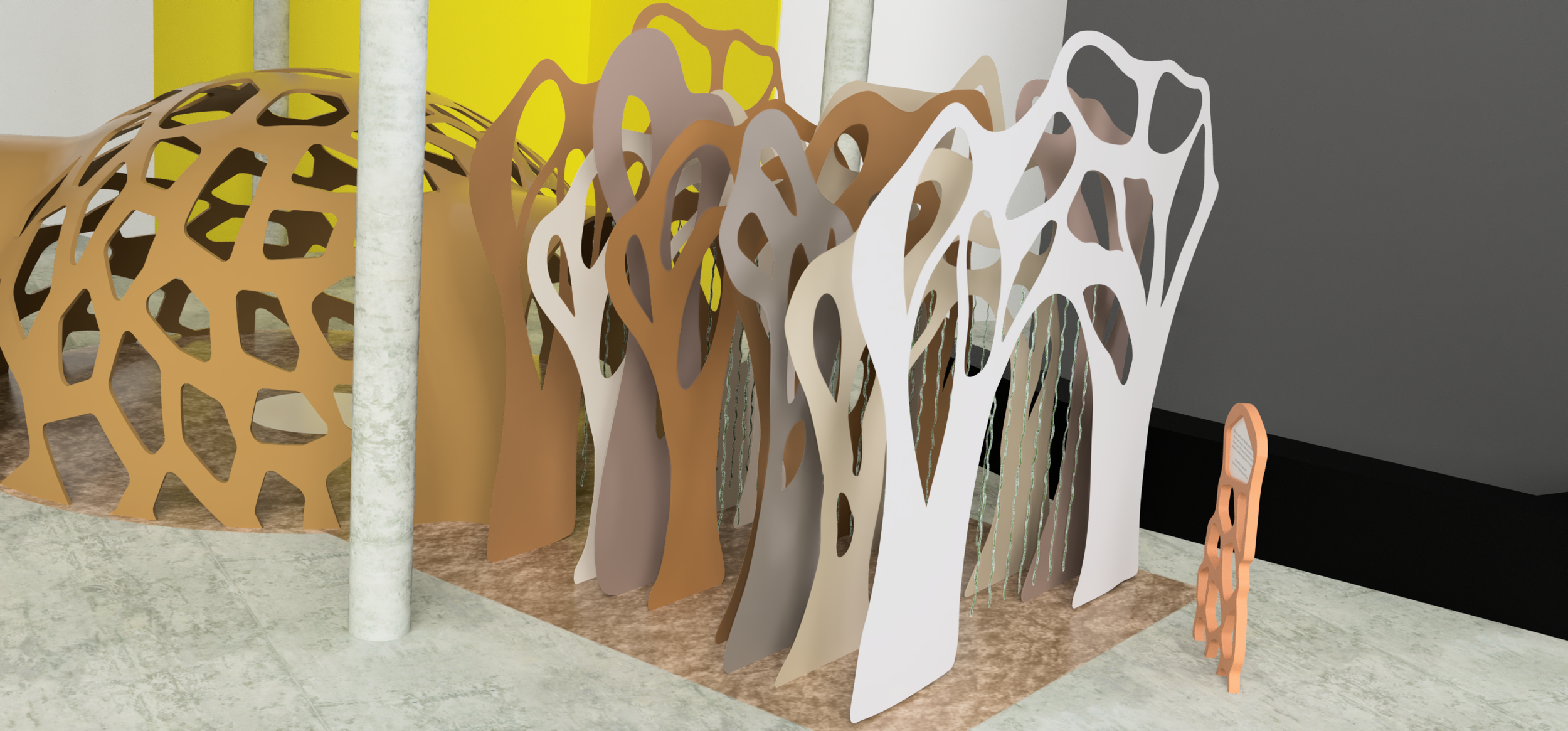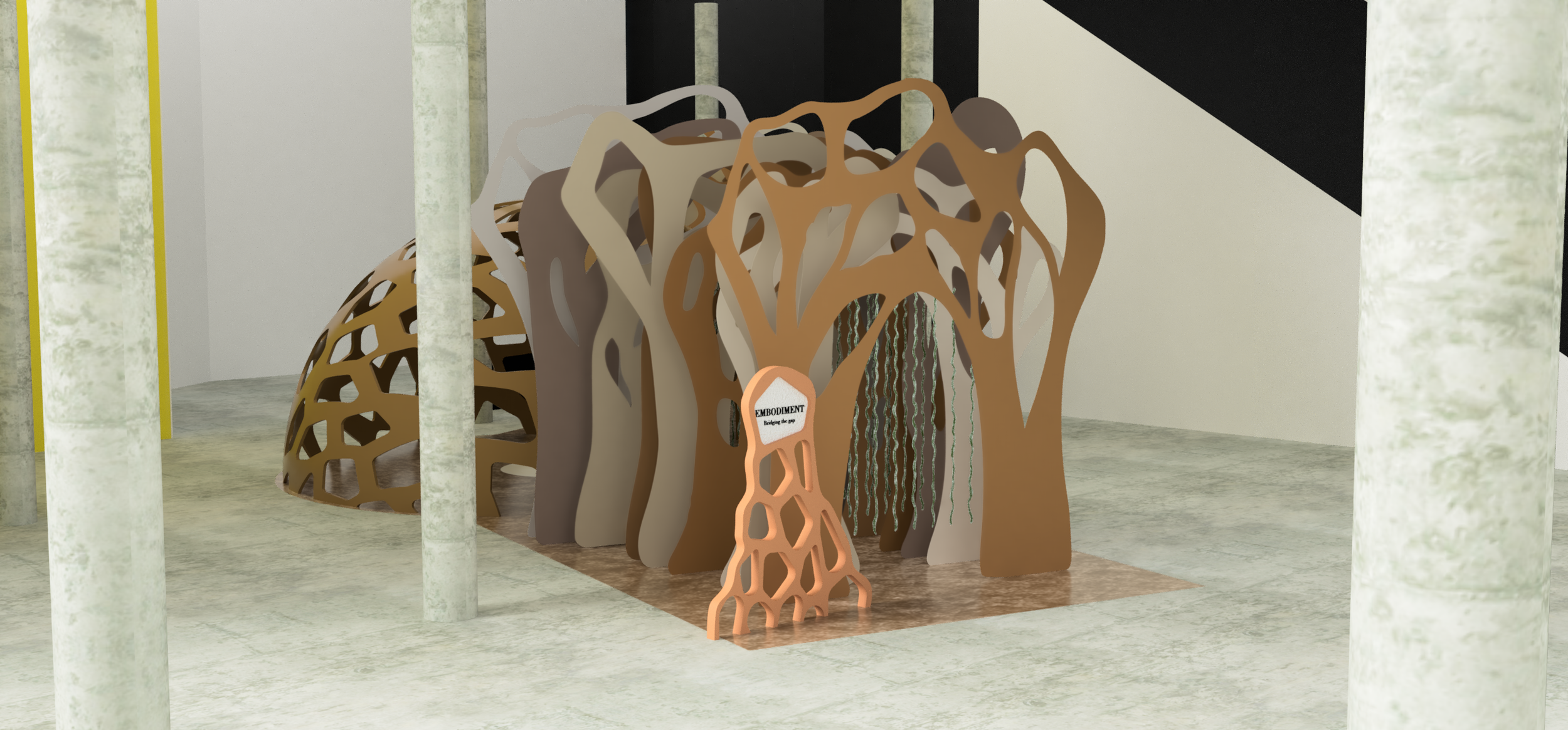 Displaying the work of Mathias Bengtsson in the centre of the large dome, this proposed exhibition focuses on how nature inspires innovation and is an immersive experience which would allow visitors to engage with physical work. The main structure would be manufactured using large scale 3D printing and local biodegradable materials to link it to the designers ideology and celebrate biomorphic design.