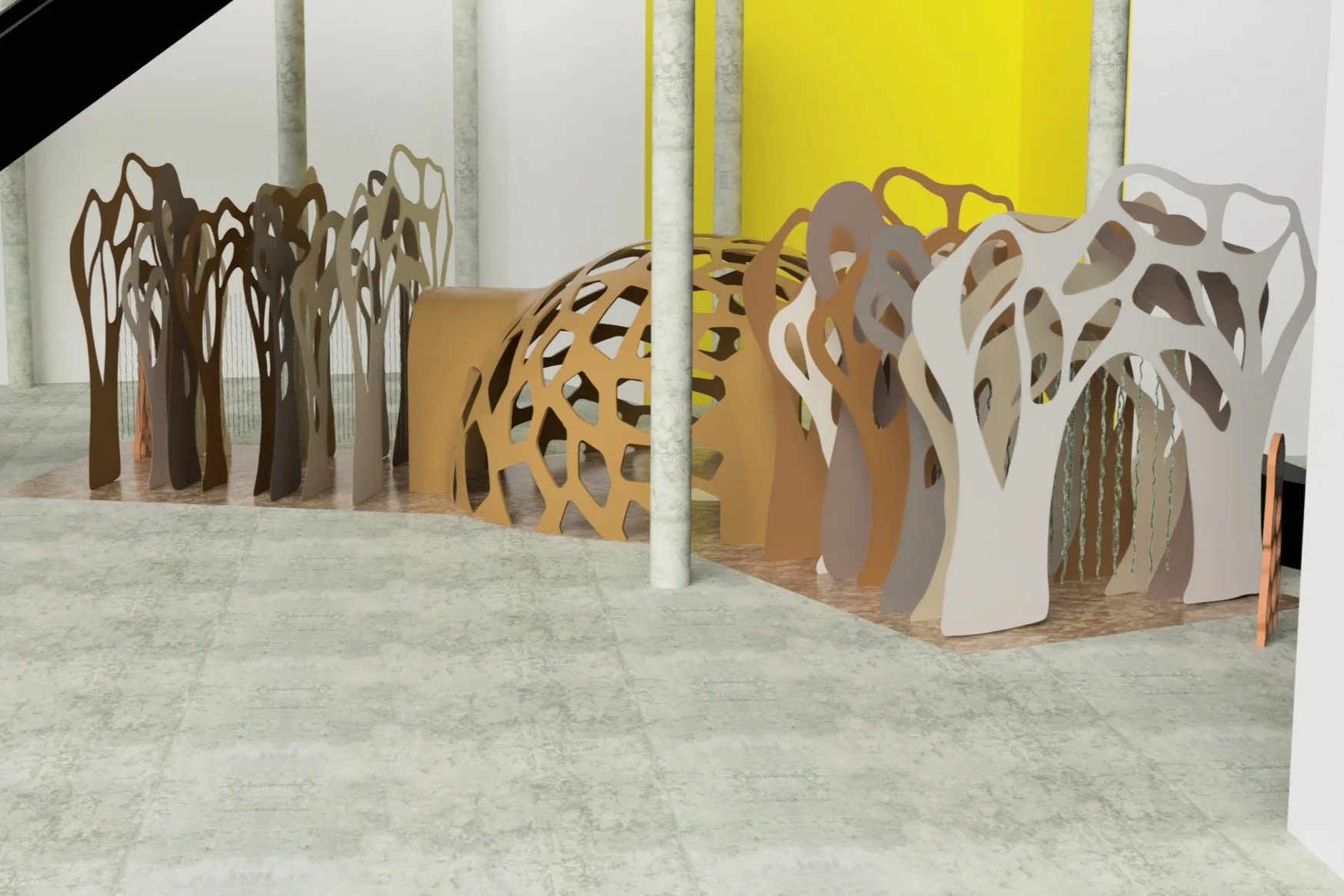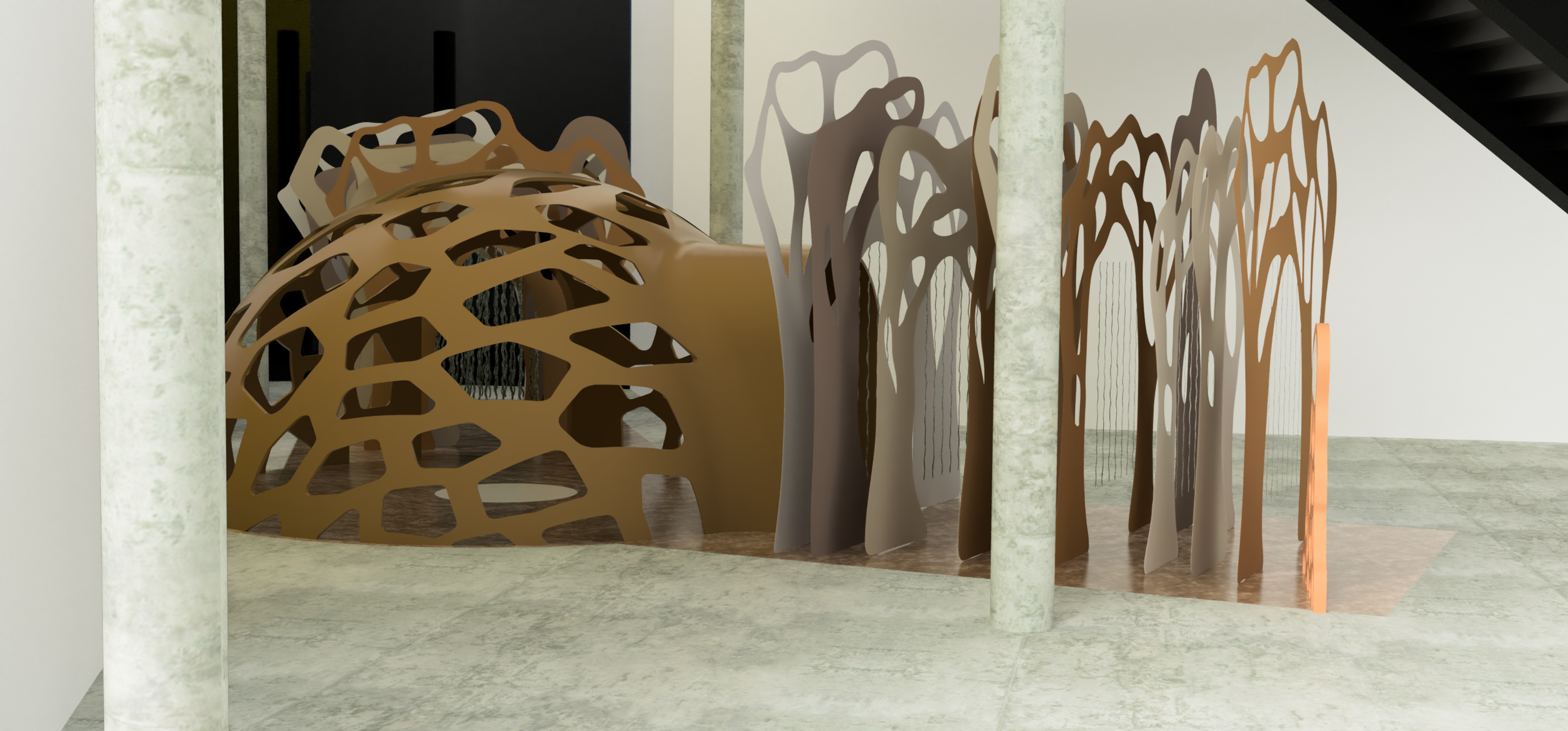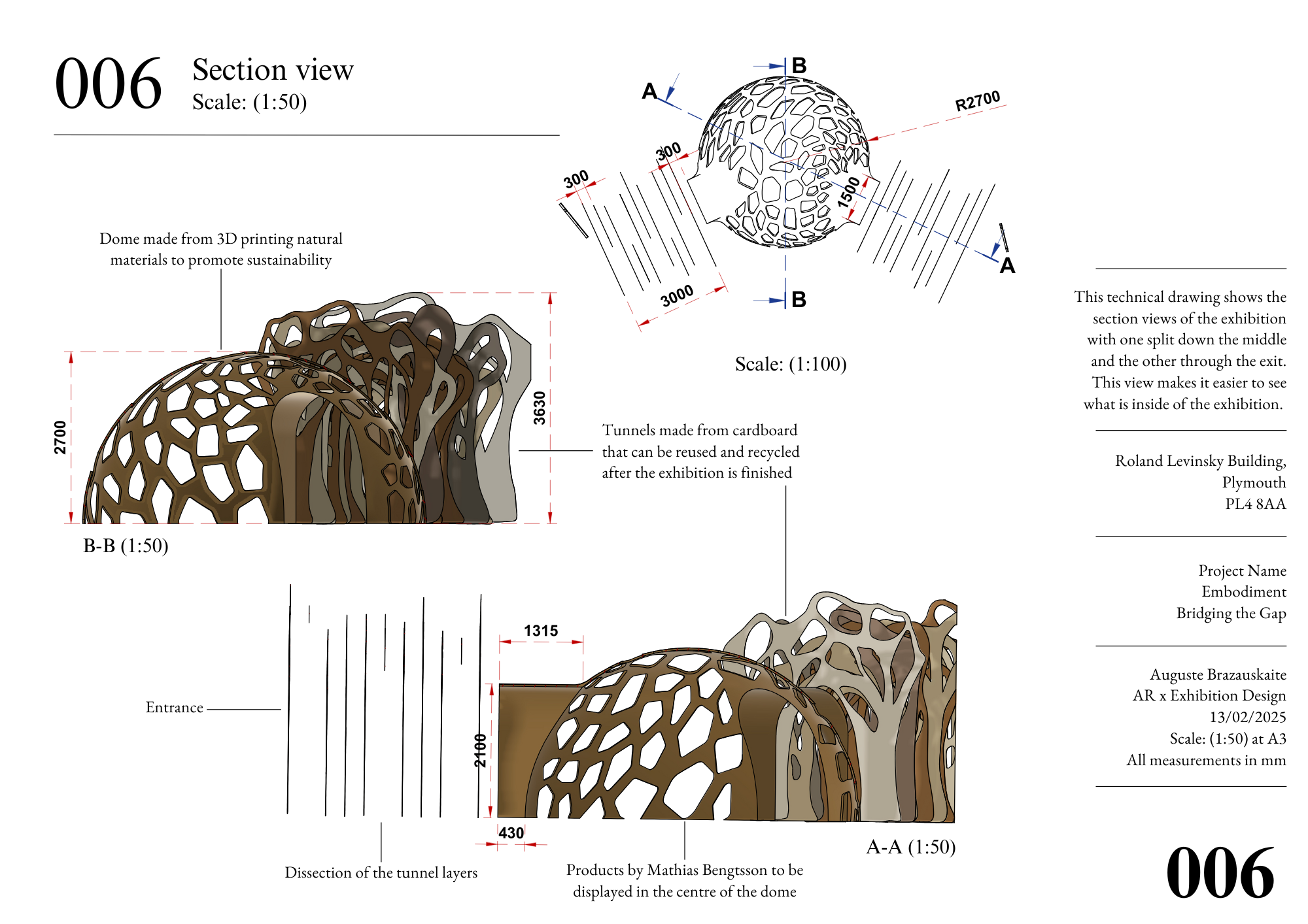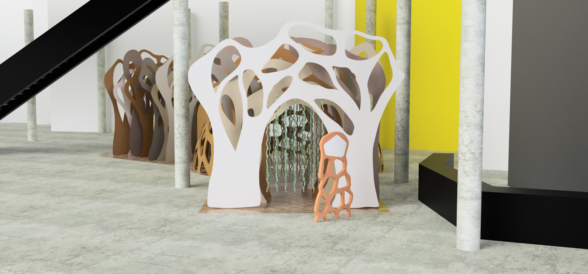 Displaying the work of Mathias Bengtsson in the centre of the large dome, this proposed exhibition focuses on how nature inspires innovation and is an immersive experience which would allow visitors to engage with physical work. The main structure would be manufactured using large scale 3D printing and local biodegradable materials to link it to the designers ideology and celebrate biomorphic design.